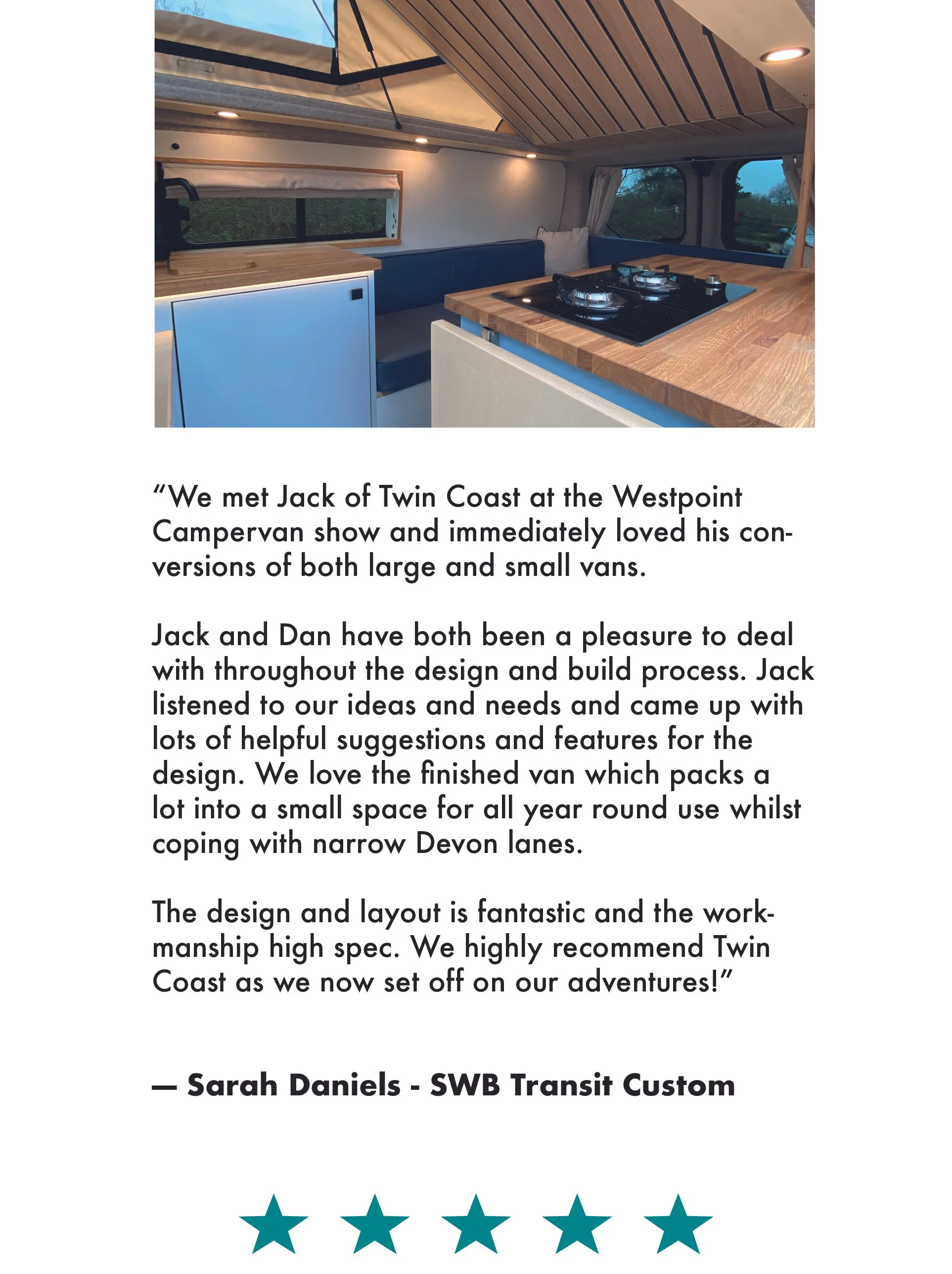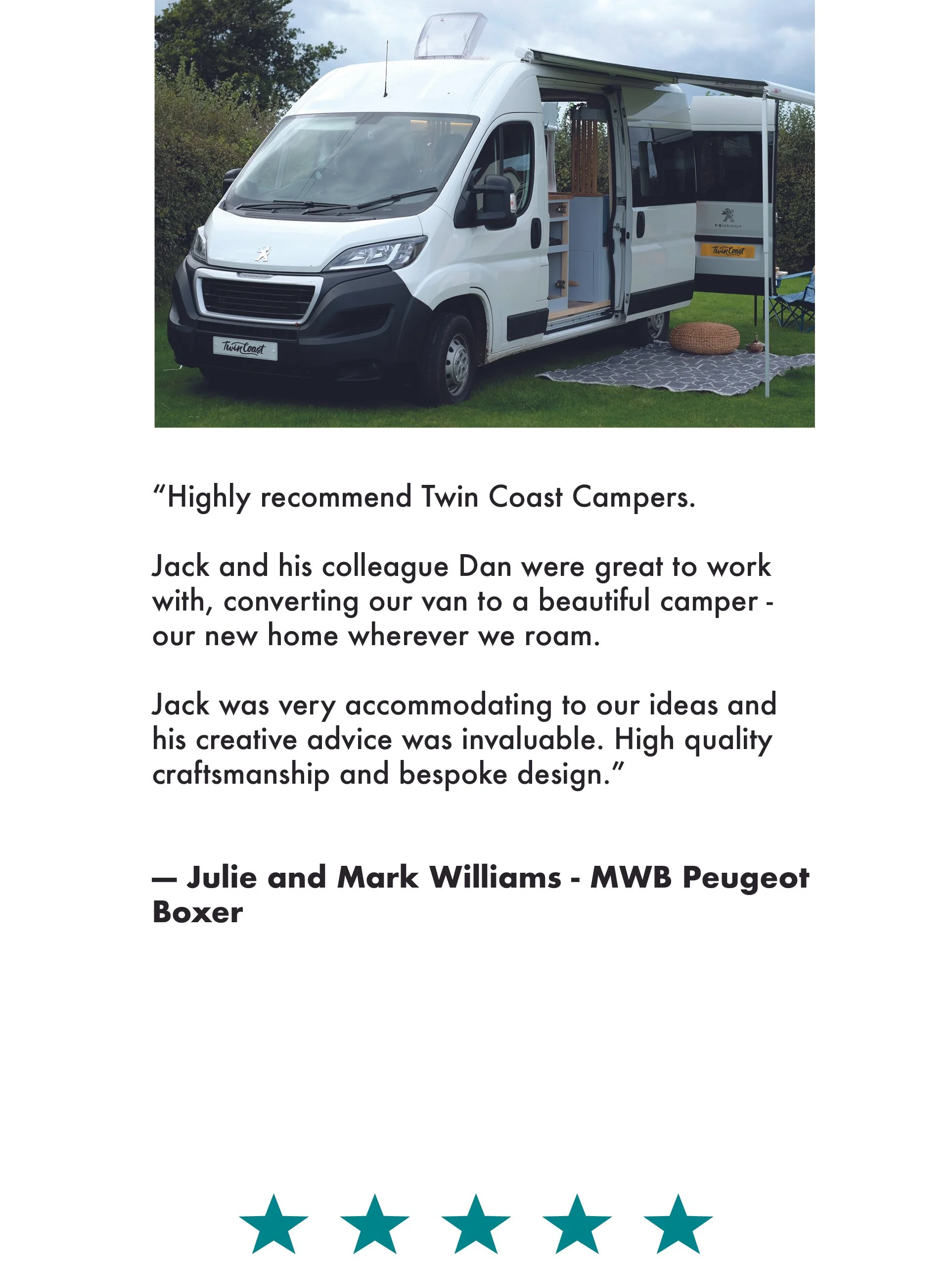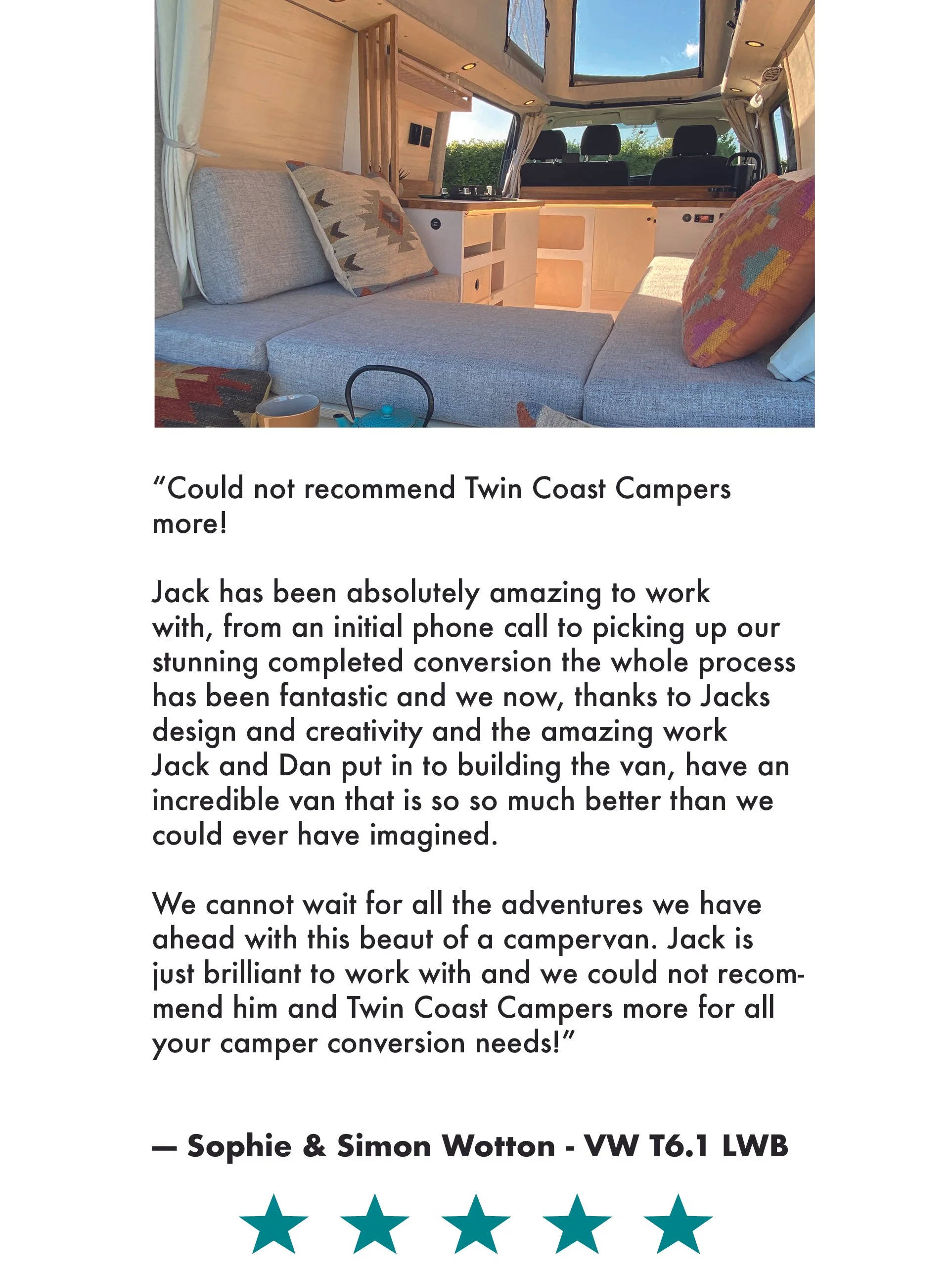 “Highly recommend Twin Coast Campers. Jack and his colleague Dan were great to work with, converting our van to a beautiful camper - our new home wherever we roam. Jack was very accommodating to our ideas and his creative advice was invaluable” - Mark and Julie Williams