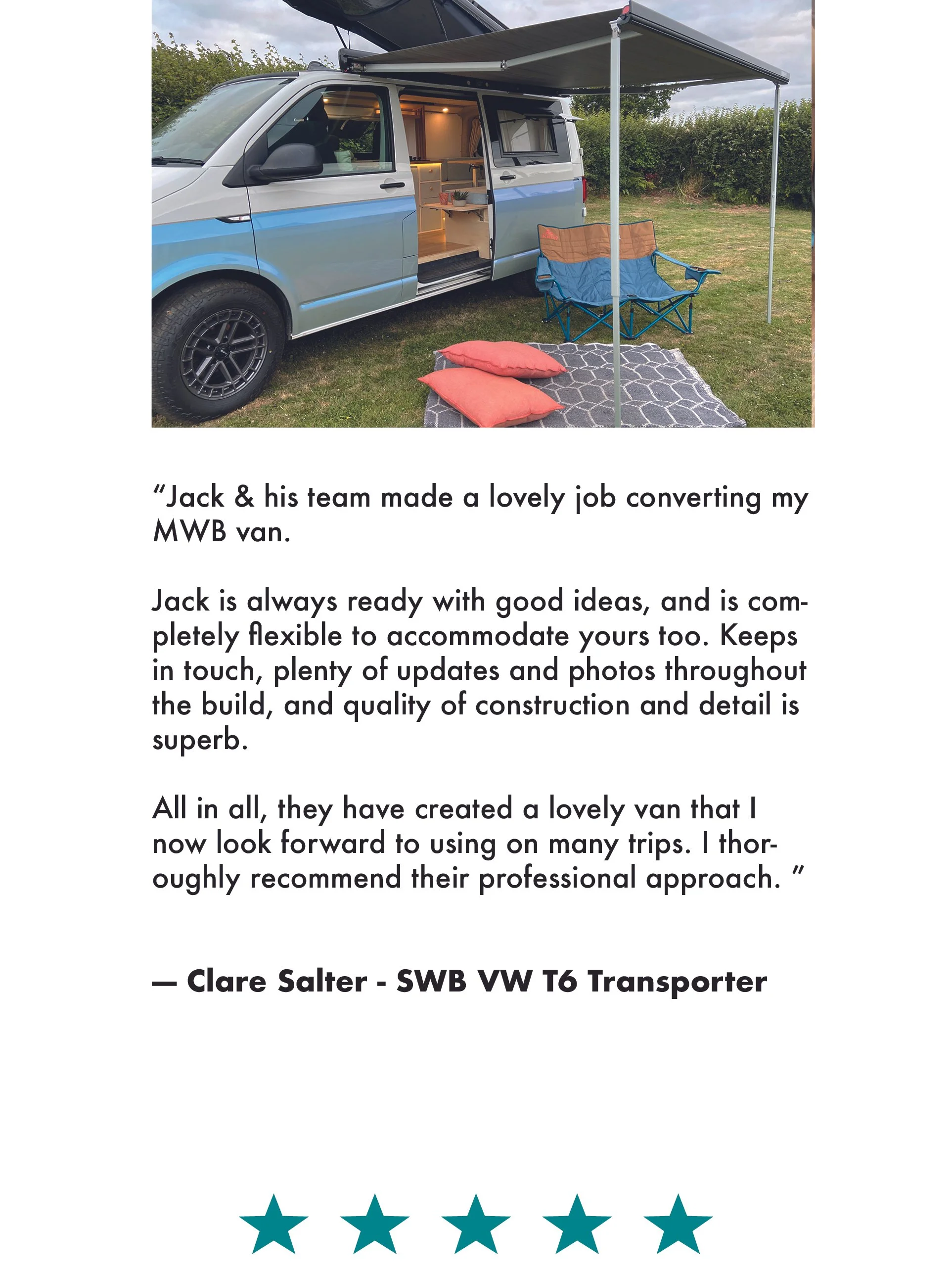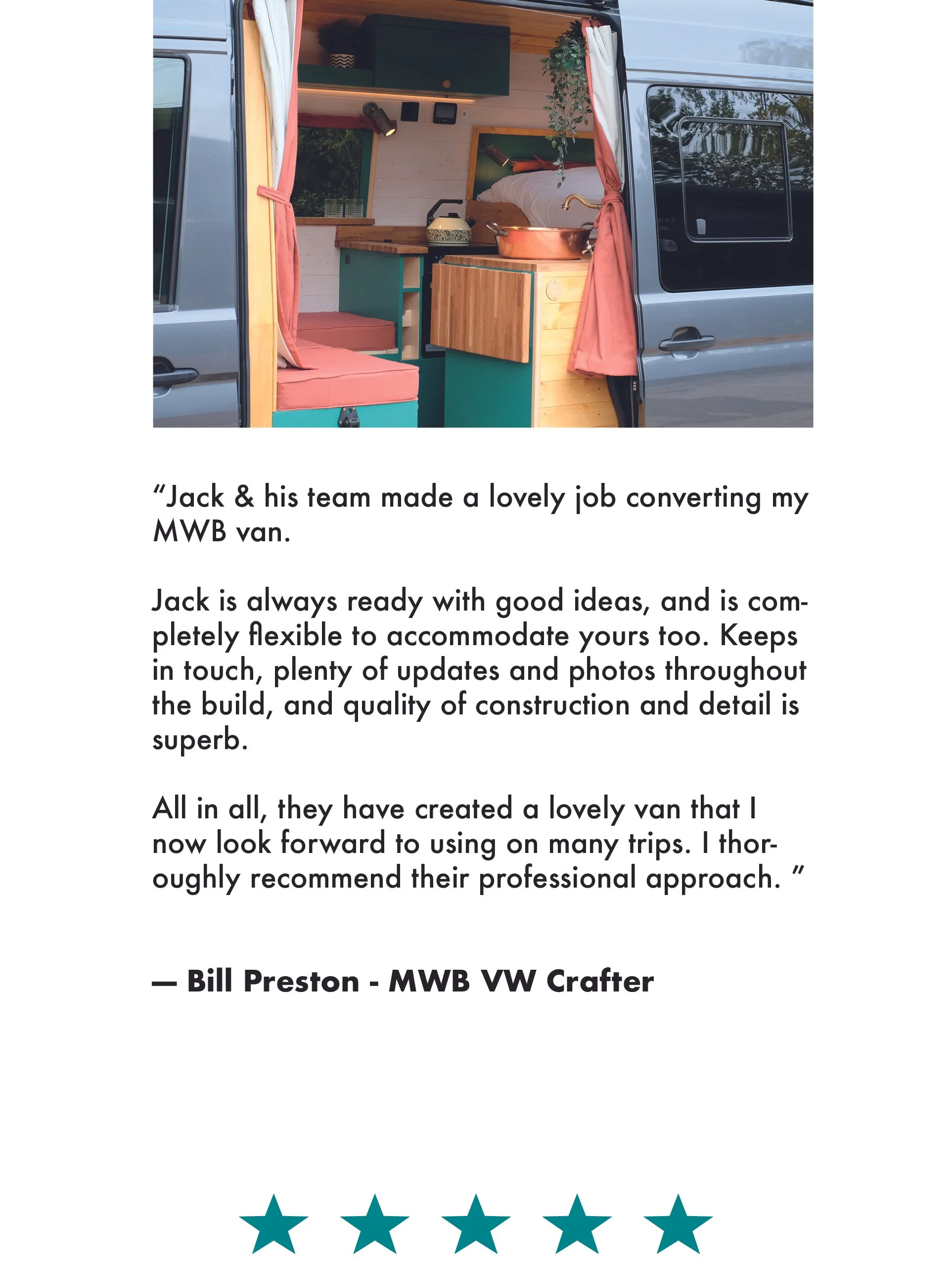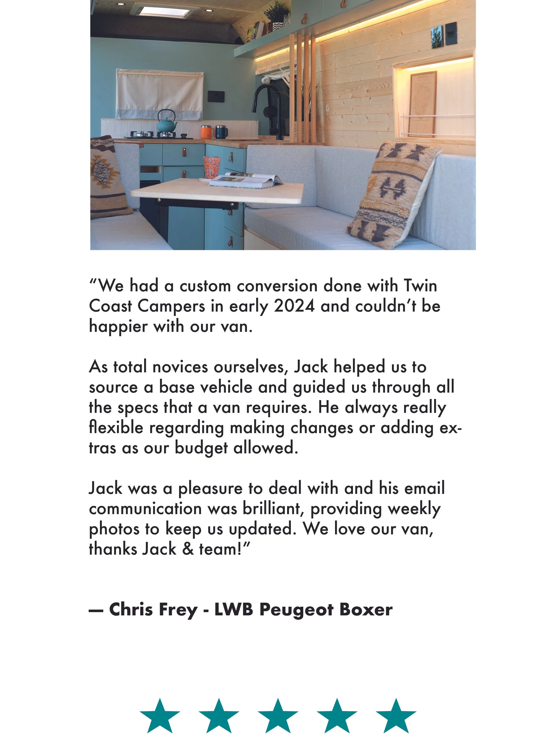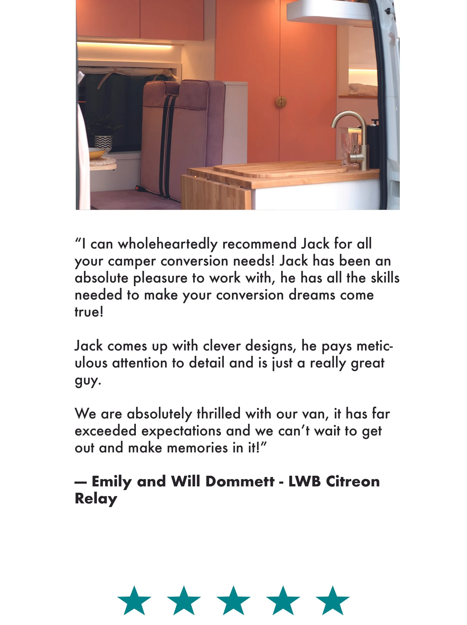 “Highly recommend Twin Coast Campers. Jack and his colleague Dan were great to work with, converting our van to a beautiful camper - our new home wherever we roam. Jack was very accommodating to our ideas and his creative advice was invaluable” - Mark and Julie Williams